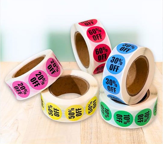 Easy Tag 3000 PCS Garage Sales Stickers, Percent Discount from 10% to 60% Adhesive Percent Off Labels, 0.87" Diamete for Retail Store, Yard Sale Price Stickers, 6 Rolls (Vivid Style)
