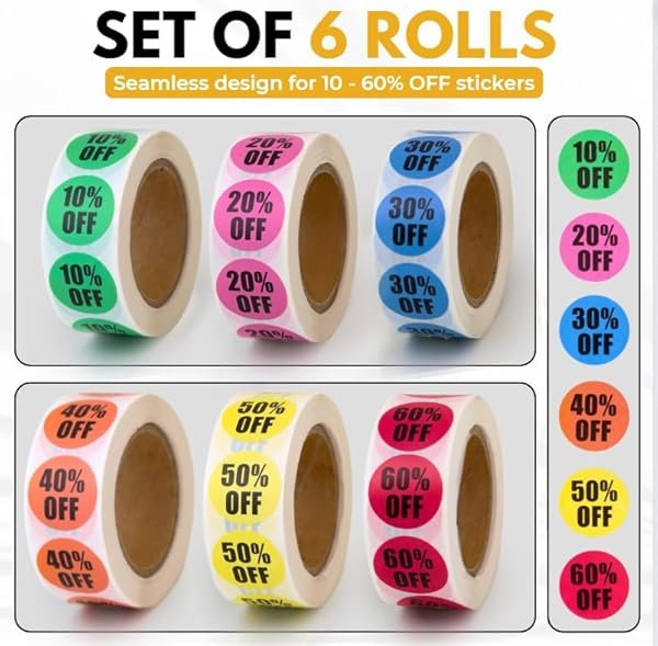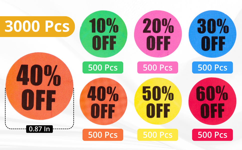 Easy Tag 3000 PCS Garage Sales Stickers, Percent Discount from 10% to 60% Adhesive Percent Off Labels, 0.87" Diamete for Retail Store, Yard Sale Price Stickers, 6 Rolls (Vivid Style)