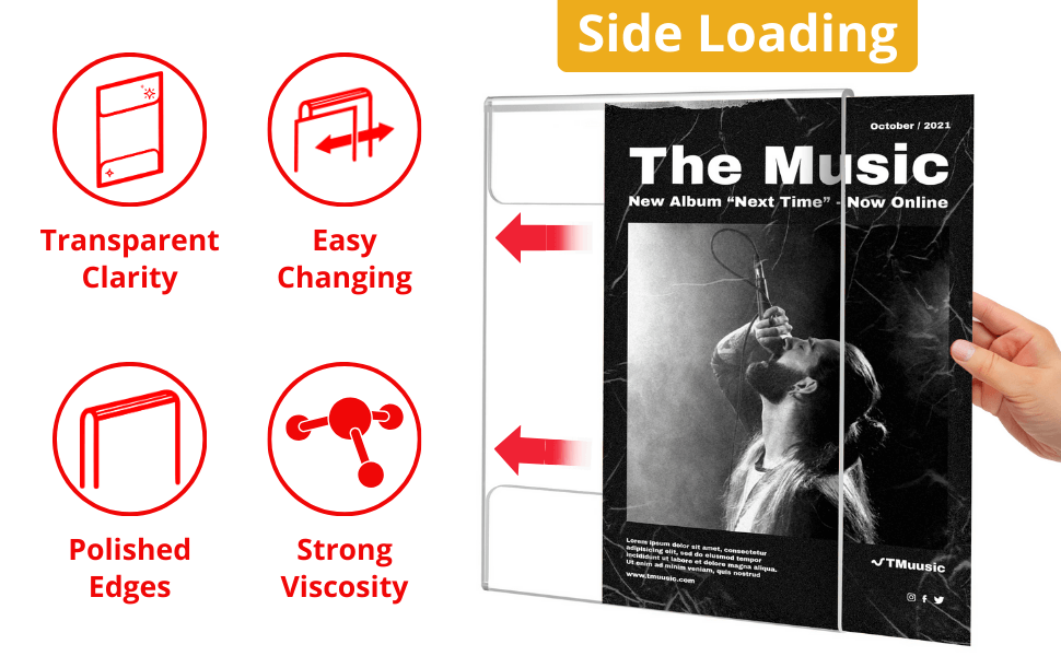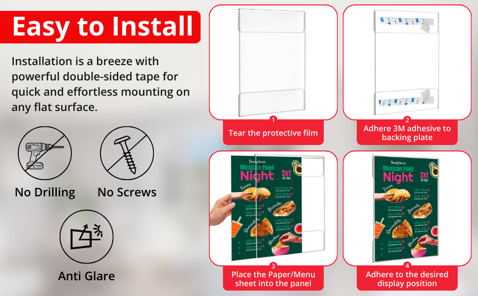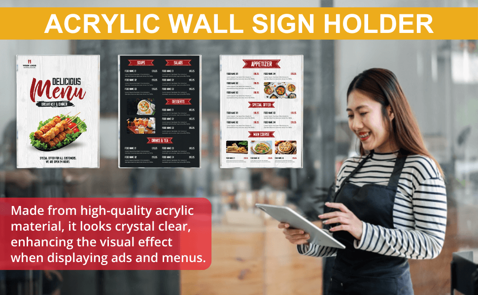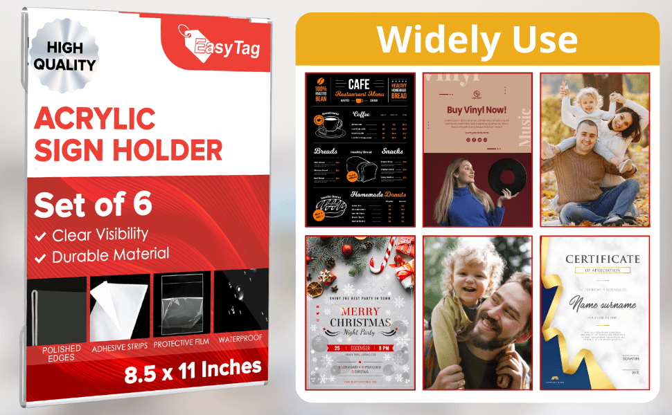 The Easy Tag 8.5 x 11 Acrylic Sign Holder offers a sleek, professional solution for displaying menus, certificates, announcements, promotional materials, and more. Designed for easy wall mounting with strong adhesive strips, this clear acrylic frame provides a polished look without the need for drilling—perfect for businesses, schools, homes, and retail environments.