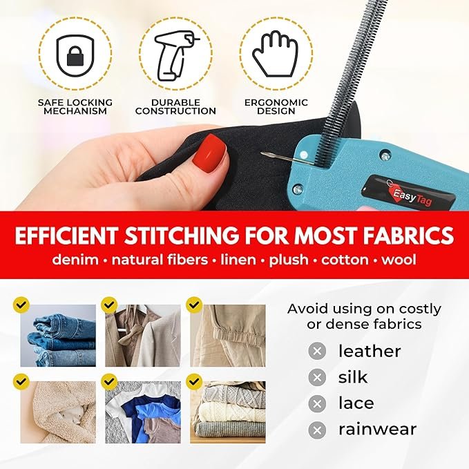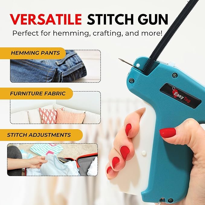 The Easy Tag Stitching Gun for Clothes is a compact and convenient solution for quick sewing, hemming, quilting, and clothing repairs. Ideal for both beginners and professionals, this fine-stitch handheld tool offers precision and ease of use, making it a reliable addition to any sewing or crafting setup. It includes 2,000 two-tone fasteners and a needle so you can start stitching immediately.